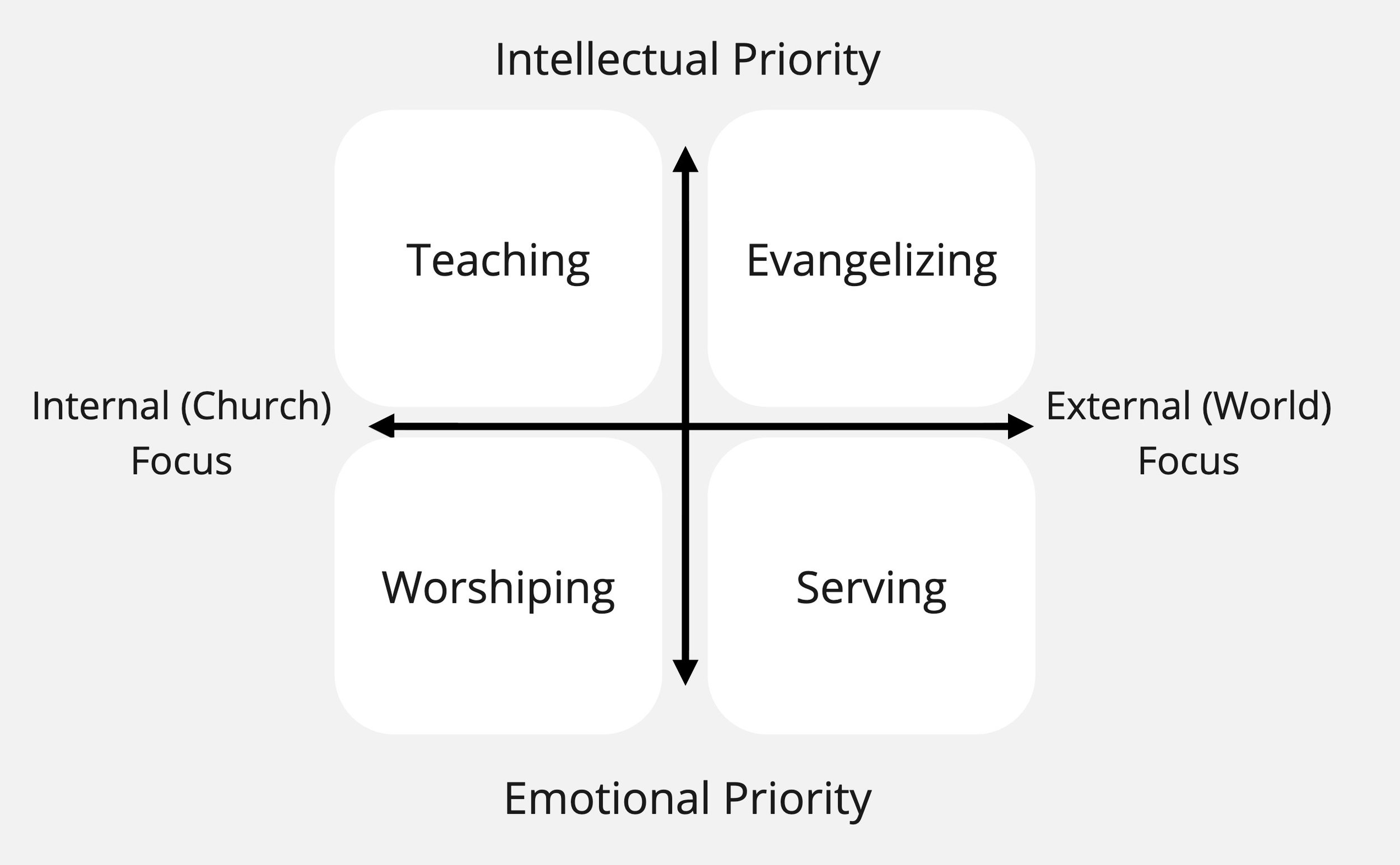 Each quadrant of the Ministry Matrix reflects a core purpose of the Church—teaching the Word, worshiping God, serving others, and evangelizing the lost. Together, they form a complete picture of what the Church is called to be and do.